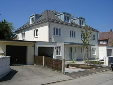 München- Denning Schneidemühlerstr. 13 Die exklusiven Doppelhäuser (Fertigstellung 2005) mit einer Wfl von 190 qm und einer Nutzfläche von 70 qm befinden sich in einer beliebten Wohngegend in München-Denning. Beide Häuser bestechen durch großzügige Grundrisse und eine hochwertige Ausstattung, wie EIBUS, Fußbodenheizung etc. Alle Räume werden durch große Fensterfronten mit Licht durchflutet, haben hochwertige Parkett - bzw. Fliesenböden, raumhohe Türen und einen offenen Kamin. Der großzügige Eingangsbereich ist vom Wohnbereich durch eine raumohe Glasschwingtür getrennt. In einer Doppelhaushälfte wurde ein besonderes Highlight durch eine offene Galerie und raumhohe ca. 5,60 m hohe Fenster geschaffen. Ansicht von der Schneidemühlerstr ![]() ![]() Ansicht Rückseite ![]() Ansicht von der Schneidemühlerstr |
